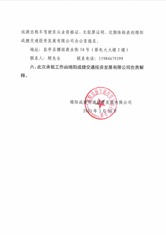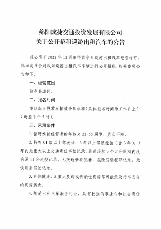 绵阳成捷交通投资发展有限公司关于公开招租巡游出租汽车的公告