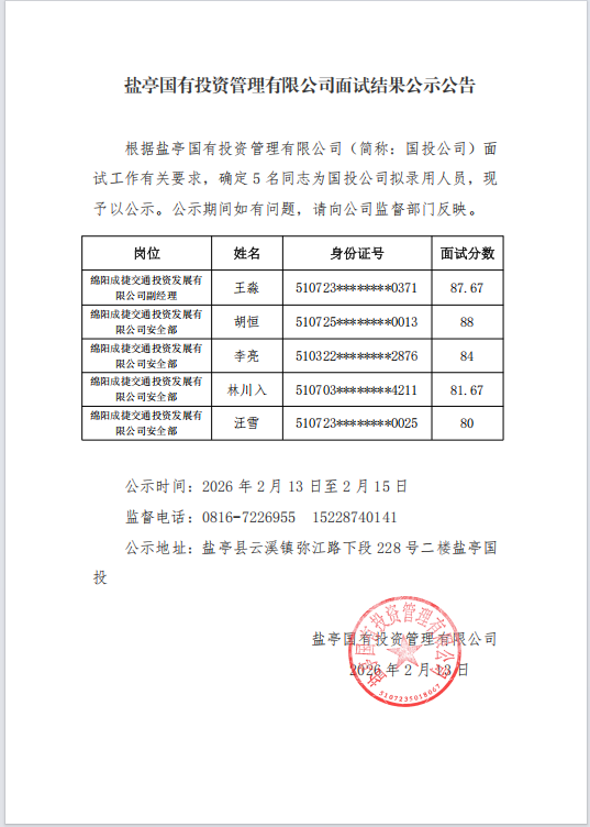 盐亭国有投资管理有限公司面试结果公示公告